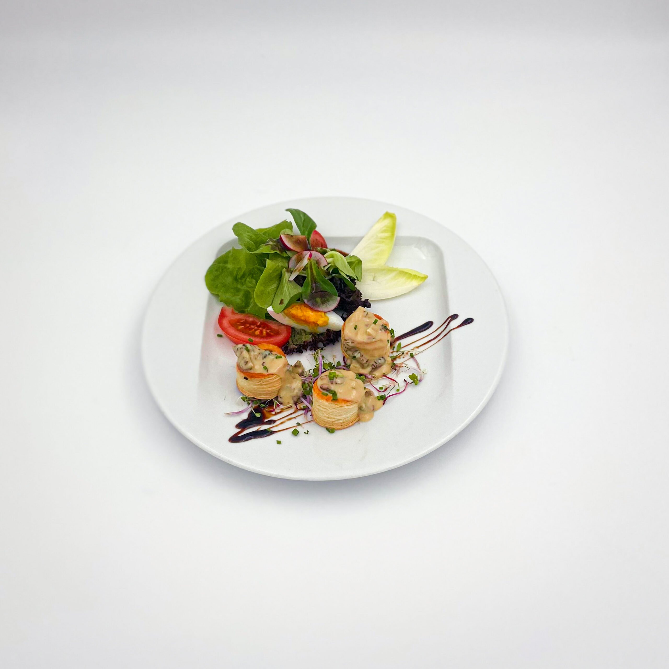Frühlingssalat (mit Spargel und Morchel gefüllte Minipastete / Salatbouquet)